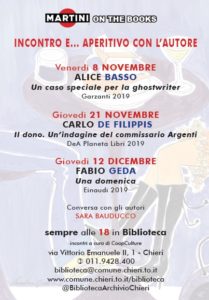 Primo appuntamento di MARTINI ON THE BOOKS  venerdì 8 novembre alle 18 con Alice Basso https://www.comune.chieri.to.it/biblioteca/martini-books-2019