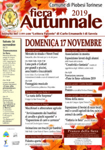 Sabato 16 e domenica 17 novembre avrà luogo a Piobesi Torinese la Fiera Autunnale 2019, un evento che risale al lontano 1599 quando venne istituito da Carlo Emanuele I di Savoia.