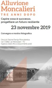 Sabato 23 novembre 2019, a partire dalle ore 9.30, avrà luogo a Moncalieri, presso il Salone Famija Moncalereisa (via V. Alfieri 40), il convegno “Alluvione Moncalieri: tre anni dopo. Capire cosa è successo, progettare un futuro resiliente”. Contemporaneamente al convegno, sarà inaugurata la mostra fotografica “Effetto alluvione. Incanto e disperazione”.