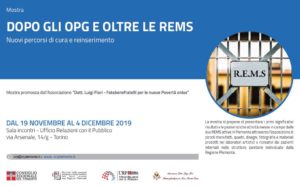 Mostra “Dopo gli OPG e oltre le REMS. Nuovi percorsi di cura e reinserimento”, promossa dal Consiglio regionale del Piemonte in collaborazione con l’Associazione “Dott. Luigi Fiori – Fatebenefratelli per le nuove Povertà onlus” di San Maurizio Canavese, che si terrà presso la Sala incontri dell’Ufficio Relazioni con il Pubblico del Consiglio regionale dal 19 novembre al 4 dicembre 2019.Via Arsenale 14/g – 10121 Torino