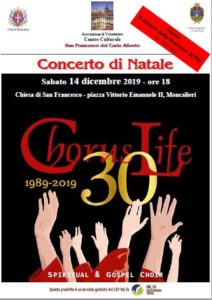 Il Centro Culturale “San Francesco del Carlo Alberto” invita al Concerto di Natale che avrà luogo presso la chiesa di San Francesco in piazza Vittorio Emanuele II  a  Moncalieri,dopo la Santa Messa delle ore 17: sabato 14 dicembre  alle ore 18 Concerto di Natale  con il Chorus Life Spiritual & Gospel Choir
