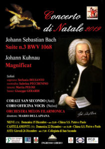 Il concerto di Natale di quest’anno della Corale San Secondo offre un ricco programma incentrato sulle belle musiche che, a partire dalla metà del seicento, invasero chiese e palazzi con la loro voglia di stupire e divertire l’ascoltatore. In particolare, due opere del programma ben rappresentano la musica che in quel periodo nacque in Germania, per poi diffondersi nel resto del mondo: la celebre Suite N.3 in Re maggiore per orchestra del principale rappresentante del barocco tedesco, Johann Sebastian Bach, e lo splendido Magnificat in Do maggiore per soli, coro e orchestra di un altro compositore tedesco, Johann Kuhnau, ugualmente grande anche se meno conosciuto, che verranno eseguiti insieme ad altri brani dei due autori. La parte strumentale sarà affidata all’Orchestra Melos Filarmonica di Torino, mentre la parte corale si avvarrà del contributo del coro Officina Vocis di Neive, ambedue collaudati partner nei principali concerti della Corale. Infine, le parti soliste saranno affidate alle voci del soprano Stefania Delsanto, del contralto Sabrina Pecchenino, del tenore Mattia Pelosi e del basso Giuseppe Gerardi. Dirigerà il M° Mario Dellapiana.