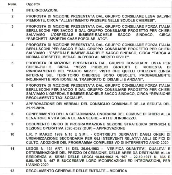 E’ convocato per le 19,45 di giovedì 19 dicembre, con prosecuzione venerdì 20 alla stessa ora, il consiglio comunale di Chieri nella sua ultima seduta del 2019.