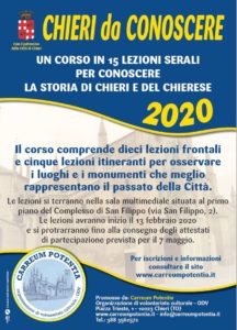 Il 13 febbraio prossimo partirà il XIV appuntamento di Carreum Potentia per conoscere più da vicino la Storia della città di Chieri. Mediante un percorso che parte dall’Antichità e si sviluppa lungo i secoli trascorsi, sarà possibile conoscere la politica, il costume, gli uomini e le famiglie notabili, l’arte e l’architettura, l’economia, la religione e i paesaggi che hanno costruito nel tempo la personalità della Città.Il corso è articolato in 10 lezioni frontali e 5 itineranti. Si terrà il giovedì sera, dalle ore 20,30 alle 22, nella sala multimediale posta al primo piano del Complesso di San Filippo di Chieri, raggiungibile dall’ingresso di via San Filippo, 2. Le lezioni “itineranti”, collocate la domenica pomeriggio, constano di visite ad alcuni monumenti cittadini e di alcuni itinerari tracciati allo scopo di dare forma visiva al tema in programma. Il corso si concluderà il 7 maggio con la consegna degli attestati. Il costo di partecipazione al corso è di 20€.Il programma del Corso sarà pubblicato sul sito di Carreum Potentia a partire dall’inizio di gennaio 2020 e sarà inoltre consegnato ai partecipanti, insieme ai materiali utili a seguire le lezioni, in occasione della loro iscrizione.Per maggiori informazioni potete visitare il sito www.carreumpotentia.it