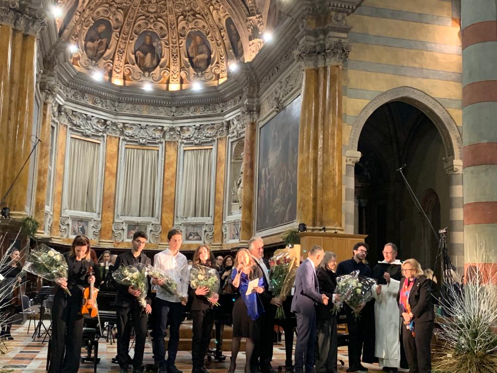 Un afflusso di pubblico attento e generoso oltre le aspettative per il “Gran Concerto per l’elevazione dello Spirito attraverso la Grande Musica in attesa del Santo Natale” che si è tenuto domenica 22 dicembre 2019 alle ore 17:00  presso la Chiesa di San Domenico a Chieri. L’evento, organizzato dall’Istituto Culturale I.C.A.B,  in collaborazione con i Frati Domenicani e l’associazione V.I.T.A, con  Partner dell’evento, il Rotary, Distretto 2031 e inserito tra gli eventi natalizi “Che Natale” dalla Città di Chieri, anche Ente Patrocinante che ha visto il saluto all’evento di Fra Angelo Rettore di San Domenico, del Sindaco Alessandro Sicchiero e del Governatore del Rotary Distretto 2031 Giovanna Mastrotisi, ha avuto come finalità la raccolta di Fondi per il Reparto di Pediatria dell’Ospedale Maggiore di Chieri.  Un repertorio di altissimo livello: Romanza in Fa maggiore Op. 50 di Ludwig van Beethoven  per violino e Orchestra con al Violino Martina Amadesi;  Concerto in Re maggiore  di Franz Joseph Haydn per pianoforte;  Concerto in Do minore BW 1060 di Johann Sebastian Bach  per due pianoforti e orchestra;  Concerto K 365 in Mi bemolle maggiore  di Wolfgang Amadeus Mozart per due pianoforti e orchestra,  interpretato dall’Orchestra Giovanile di Torino diretta  dal M° Carlo Maria Amadesi e da giovani talenti: Morgan Icardi anni 13, Giorgio Veronese anni 16, Andrea Catalano anni 16 e M° Giulio Pagano, che sotto la direzione del Maestro Anna Maria Cigoli hanno dimostrato alta professionalità. Il Concerto K 365 in Mi bemolle maggiore  di Mozart in cui si è esibita Anna Maria Cigoli con Giulio Pagano ha meritato dieci minuti di applausi . Il Maestro Anna Maria Cigoli che ha affiancato all’intensa attività concertistica internazionale l’attività dell’insegnamento ci dice: “La Musica, sorgente di Bellezza e di Benessere fisico e spirituale, è arrivata anche qui, insieme a me, perché io la porto sempre, ovunque vada, per irrorare di Luce, Pace e Meraviglia ogni cosa su cui essa si posa…” ….“invincibile Arma di Pace ed inesauribile fonte di Educazione, Intelligenza, Sensibilità ed Evoluzione”. Nella foto: da sinistra a destra, Martina Amadesi, Andrea Catalano, Giorgio Veronese, Morgan Icardi, Paola Bertolina (Presidente Istituto Culturale I.C.A.B.), Carlo Maria Amadesi, Alessandro Sicchiero (Sindaco di Chieri), Anna Maria Cigoli, Giulio Pagano, Frà Angelo (Domenicani) Giovanna Mastrotisi (Governatore del Distretto 2031 del Rotary), sullo sfondo l’Orchestra Giovanile di Torino.