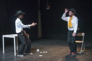 Due cow-boy, poi improbabili danzatori, o forse solo due esseri in bilico ai limiti del paradosso. Sui margini di questo confine si pongono le due figure in scena, attraversando ciò che necessita di essere ripensato, dal rapporto con la morte a quello con la bellezza, dal senso del teatro alla sua relazione con lo spettatore. “Dove si colloca oggi il teatro contemporaneo – si chiedono i protagonisti – in quale organo del corpo sociale? Nella mente o nello stomaco, in attesa di essere digerito? O tenta acrobaticamente una sintesi che appaghi l’una e l’altra istanza?”.