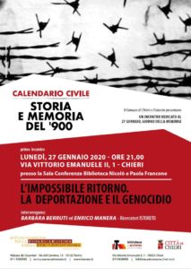 In occasione del giorno del Ricordo, Comune di Chieri e Istoreto invitano alla serata L’impossibile ritorno. La deportazione e il genocidio. Intervengono Barbara Berruti ed Enrico Manera.Appuntamento lunedì 27 gennaio, in Sala Conferenze, alle ore 21. In continuità con i cicli Storie e miti della Grande Guerra e Il rosso e il nero. Il primo dopoguerra e le origini della guerra civile, Istoreto e il Comune di Chieri, Archivio e Biblioteca propongono 3 incontri dedicati a date significative del Calendario civile e a ricorrenze dal titolo Storia e memoria del ‘900. Il primo appuntamento, L’impossibile ritorno. La deportazione e il genocidio, dedicato al Giorno della memoria, sarà un incontro sulla storia e sulla memoria del genocidio ebraico e della deportazione politica nel III Reich; saranno inoltre, affrontate la questione degli apolidi e delle migrazioni generate dalla violenza sui civili e la questione dei difficili ritorni dei sopravvissuti dai campi, con particolare attenzione alla questione dei Displaced People e del sistema della loro protezione e tutela.