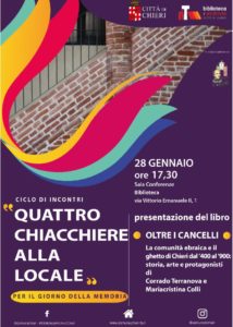 Martedì 28 gennaio, in Biblioteca, Sala Conferenze, per la serie di appuntamenti “Quattro Chiacchiere alla Locale”, in occasione del Giorno della Memoria, è stato presentato il libro “Oltre il cancello. La comunità ebraica e il ghetto di Chieri dal ‘400 al ‘900: storia, arte e protagonisti.” Il lavoro, curato da Corrado Terranova e Mariacristina Colli, con le introduzioni di Dario Disegni e Alberto Cavaglion, si avvale del contributo di Claudio Bertolotto, Giovanni Donato, Filippo Ghirardi, Marisa Gilardi, Simonetta Sabaino, Vincenzo Tedesco e Guido Vanetti.