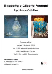 Sabato 1 febbraio, alle ore 11,00, sarà inaugurata a Domodossola, presso lo spazio Gallery ufficio dei Private Banker (Via G. Marconi 26) la mostra pittorica di Elisabetta e Gilberto Fermani (padre e figlia). Gilberto Fermani dipinge dagli anni settanta. Ha realizzato numerose mostre personali e partecipato a collettive in Italia e all’estero. Pittore creativo, profondo e affilato nelle sue riflessioni, esprime la sua idea di mondo nelle opere visive e porta in Ossola una ventata di “italicum acetum”, grazie alla sua origine centro peninsulare (è nato a Civitanova Marche nel 1942). Nelle sue opere si ravvisa uno stile personale, forte, inconfondibile. Il tratto leggero e lineare, la pittura più debitrice al disegno che alla matericità del colore, le visioni fantastiche, le figure umane geometriche, quasi surreali, a tratti sembrano alludere alla lezione del “Cubofuturismo”, rivelando in realtà l’aspirazione ad un universo migliore, la critica ad un presente da rifare. Con le sue nuvole simili a sudari nucleari o scie chimiche, che navigano in un cielo che sembra perennemente scorrere e variare la sua linfa nel sottostante paesaggio desolato, cerca probabilmente, anche attraverso un linguaggio raffinato, di far prendere in considerazione il dilemma ecologico. Elisabetta Fermani (Macerata 1975) invece, agronomo e paesaggista di professione, illustratrice per passione, sperimenta sin da piccola le varie tecniche pittoriche e di illustrazione, innamorandosi dell’acrilico per rappresentare racconti e testi poetici attraverso uno sguardo surreale ed onirico. Lavora come grafica in diversi ambiti (pubblicità e architettura) e nell’editoria (riviste e libri illustrati). Espone in mostre collettive e personali in Italia e all’estero. Estratto da un progetto editoriale, il suo lavoro indaga l’animo umano e il suo rapportarsi con l’infinito visibile di notte, quando il Sole si spegne e ai nostri occhi si schiude. L’uomo è una piccola unità cosmica ordinata ed energetica sottoposta alle stesse leggi fisiche, chimiche e temporali degli oggetti che formano l’universo. Ma solo gli occhi coraggiosi ed empatici possono godere delle infinite distanze e con queste confrontarsi. In mostra le seguenti opere, tutte, tecnicamente, acrilico su cartoncino: “Il giorno”, “Il bulbo”, “L’impero delle luci”, “Paura della notte”, “Scacchi e cosmo”, “Gli elefanti volanti”. La mostra continuerà fino a fine marzo 2020 con il seguente orario: lunedì/venerdì 8,45/12,45, 15/18,45, sabato 8,45/12,45.
