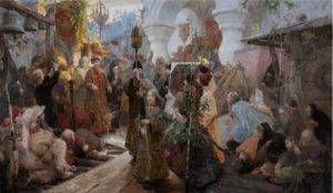 influenzato l’immaginario artistico europeo ancora prima del suo grande e decisivo momento storico dato dalla rivoluzione d’Ottobre. I ventidue dipinti, selezionati insieme alla presidente dell’Accademia Paola Gribaudo sono per lo più di grandi dimensioni e sono stati realizzati tutti da studenti come tesi di diploma o durante i diversi anni di corso di studio all’Accademia Glazunov, in un arco temporale che va dal 1999 al 2019; In questi lavori scelti è predominante il carattere storico, religioso nonché il folclore popolare della grande nazione russa. La morte misteriosa del piccolo zarevic Dimitri, all’epoca di Boris Godunov, suicidatosi o forse ucciso per una congiura. Una scena di corte ai tempi di Ivan il terribile, processioni nuziali di grande fascinazione visiva o ancora l’azione taumaturgica del futuro San Basilio nelle strade di Mosca e immagini della capitale moscovita al tempo dei boiari o fiere presso altre città russe, sono alcuni episodi delle opere oggi presentate che maggiormente colpiscono per la loro forza rappresentativa. Di particolare pregio il lavoro sui paesaggi, come le vedute di alcune chiese di Mosca e di un antico monastero greco-ortodosso, quello dell’assunzione di San Cirillo, insieme a un paesaggio in cui scorre lieve il passaggio dalla stagione invernale a quella primaverile; ed ancora scorci moscoviti del Cremlino o del monastero di Novodevičij. A questa selezione si aggiungono alcuni acquarelli e matite su carta, piccole opere d’arte ispirate alle bylìny, componimenti della tradizione epica orale russa. Concludono questo percorso una natura morta e un ritratto di una giovane fanciulla nei pressi di un pozzo. Queste opere sono caratterizzate da una tecnica che solo ad una lettura fuggente può apparire esclusivamente virtuosistica, nella sapienza dell’uso del colore e nella precisione dei dettagli d’insieme; invece l’eco di cui risuonano questi dipinti, ovvero quello della felice stagione della pittura russa del realismo e verismo ottocentesco, li rendono, sì una riproposta dell’antico ma anche una sfida modernissima a un tempo. Essi ci restituiscono l’incanto di un tempo perduto, ricreano atmosfere lontane, riportando indietro la nostra concezione del tempo e dell’arte, come solo il teatro dei grandi registi della scena e i massimi registi cinematografici hanno saputo fare in epoca contemporanea. Si pensi, in ambito russo, alle perfette realizzazioni per il teatro o per il cinema dovute alla maestria di registi come Alexandr Sokurov o Nikita Michalkov; di questi artisti certamente non potranno mancare alcune visioni di loro capolavori, come corollario di studio e approfondimento per questa singolare mostra nella nostra Accademia Albertina, in questa celebrazione del mondo russo e del suo innegabile fascino.