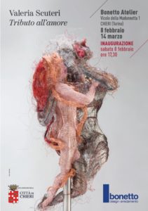 Valeria Scuteri ama mettersi in gioco. Non è da tutti gli artisti infatti avventurarsi al di fuori dei propri spazi espositivi abituali. L’occasione però è delle migliori, perché assieme a Bonetto design-arredamento ha voluto creare un vero e proprio evento culturale, per rendere ancora una volta omaggio alla città di Chieri, alla sua tradizione tessile e alla Fiber Art, espressione di cui è stata indubbiamente magica anticipatrice. La mostra, come recita il suo titolo, è un vero e proprio “tributo all’amore”. Ed è in quest’ottica che va letta e interpretata. A partire dai disegni e dai dipinti, testimonianza dei primi momenti della ricerca visiva dell’artista, fino ad arrivare alle opere più famose di Fiber Art (come “Innamorati-Il bacio”), dove vengono intrecciate “trame che formano il meraviglioso tessuto della vita e dell’amore.” Anche il calendario della mostra non è stato scelto a caso. I giorni di esposizione sono infatti a cavallo tra febbraio e marzo e includono due ricorrenze anch’esse “omaggio all’amore”: San Valentino, Festa degli innamorati e l’8 marzo, Festa della donna. Per Valeria Scuteri l’amore è energia, calore e colore. Nelle opere selezionate leggiamo sempre questo messaggio, a volte chiaro e intenso, altre sinuoso e sussurrato, ma sempre meravigliosamente poetico. Come ha perfettamente descritto Claudia Bottini, “la Fiber Art della Scuteri è un’esplosione di entusiasmo e creatività, moderna Aracne dimostra che questa antica tecnica può continuare a dare un contributo importante all’espressione umana”.