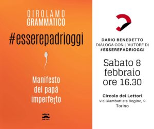 Partendo da una solida base scientifica, di cui vi è ampio rimando nella bibliografia, il libro di Girolamo Grammatico è volutamente scritto con leggerezza ed e arricchito di aneddoti ed esperienze personali. Sarà possibile scoprirne alcuni direttamente dal dialogo con l’autore, condotto da Dario Benedetto, che si terrà alle ore 16:30 di questo sabato 8 febbraio, a Torino, presso il Circolo dei Lettori, in via Bogino 9. Sarà dato spazio infine alle domande del pubblico e ci sarà la possibilità di acquistare direttamente una copia del libro “#esserepadrioggi. Manifesto del papà imperfetto”.