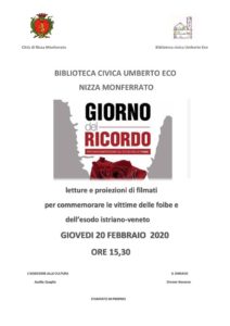 Si commemora il 20 febbraio in tutta Italia il Giorno del Ricordo, con l’obiettivo di conservare la memoria della tragedia degli italiani e di tutte le vittime delle foibe, dell’esodo dalle loro terre degli istriani, fiumani e dalmati nel secondo dopoguerra e della complessa vicenda del confine orientale. Anche a Nizza, a cura dell’assessorato alla Cultura del Comune, è stato celebrato il «Giorno del Ricordo», di quanti, dal 1943 al 1950, nei territori giuliani ed istriani furono vittime di vendette antifasciste prima e di una vera pulizia etnica dopo, in cui migliaia di persone furono uccise e gettate nelle foibe. Il Giorno del Ricordo è un’occasione per non dimenticare questi eccidi e per riflettere sui terribili eventi di quegli anni, ma soltanto dal 2004 viene celebrato.  Dopo il giorno della memoria, interessante momento di riflessione, quello offerto dalla Biblioteca Civica Umberto Eco,dove si è affrontato il tema delle foibe istriane con delle letture e la proiezione di filmati d’archivio per commemorare le vittime delle foibe e dell’esodo istriano-veneto.  Il ricordo entra in biblioteca, in un ambiente culturale, dove lo scopo di questa giornata è dare competenze e insegnare la storia, in modo da formare una coscienza critica di quello che è accaduto. Appuntamento che mette al centro il ricordo e l’approfondimento storico dei tragici eventi  che portarono allo sterminio di massa, ventimila connazionali. Tali iniziative sono, inoltre, volte a valorizzare il patrimonio culturale, storico, letterario e artistico degli italiani dell’Istria, di Fiume e delle coste dalmate, in particolare ponendo in rilievo il contributo degli stessi, negli anni trascorsi e negli anni presenti.