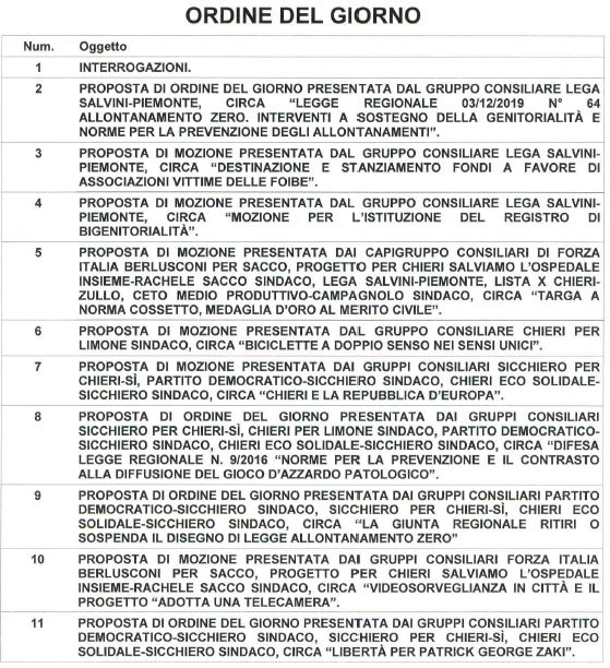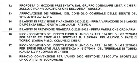 E’ convocato per giovedì 27 febbraio alle 19,45 il consiglio comunale di Chieri, che proseguirà i lavori la serata successiva.