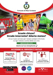 Oppure, se possiedi uno smartphone, puoi utilizzare la app FlagMii disponibile per IOS, Android, Windows Phone, che affianca il servizio di allerta Nowtice. Grazie alla geolocalizzazione, la app consente di ricevere avvisi mirati, relativi al luogo in cui ci si trova, direttamente sul proprio smartphone, e comprende anche utili strumenti per chiedere aiuto in caso di emergenza. Dopo l’installazione è necessario indicare il proprio numero di cellulare e selezionare la voce “Pino Torinese (TO) – Emergenza” nell’area “Notifiche” per ricevere gli avvisi di emergenza dal Comune. La app opera nel rispetto della privacy (info: http://www.flagmii.com/).