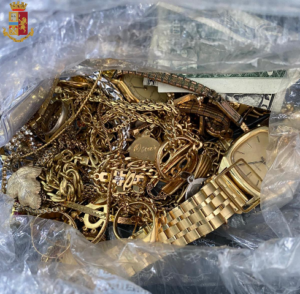 Sono circa le 17 di lunedì scorso. Una pattuglia della Squadra Volante transita su S.da del Villaretto. Alla vista dei poliziotti, due soggetti che stanno viaggiando nella direzione opposta, lanciano dal finestrino dell’autovettura un sacchetto di plastica. Insospettiti da quanto appena accaduto, gli operatori controllano il veicolo ed i suoi occupanti. Si tratta di due cittadini italiani, verosimilmente appartenenti alla comunità sinti piemontese, di 44 e 45 anni. Entrambi gli individui indossano indumenti assimilabili ad una divisa di operatore di pubblico servizio, corredata da alcuni accessori come auricolari e mascherine di tipo ospedaliero. Al momento della perquisizione gli agenti rinvengono 2 spray al peperoncino e 2640 euro in contanti, denaro di cui gli uomini non sono in grado di motivare la provenienza. Nel frattempo, una seconda pattuglia recupera il sacchetto gettato poco prima. Al suo interno i poliziotti trovano 13 collane, 5 bracciali, 16 anelli, 20 pendenti, 14 orecchini, 2 orologi, 4 spille, 2 gemelli e 7 fedi nunziali, di cui tre con incise date e nomi dei legittimi proprietari. I due soggetti, con precedenti specifici di polizia, vengono arrestati per ricettazione.