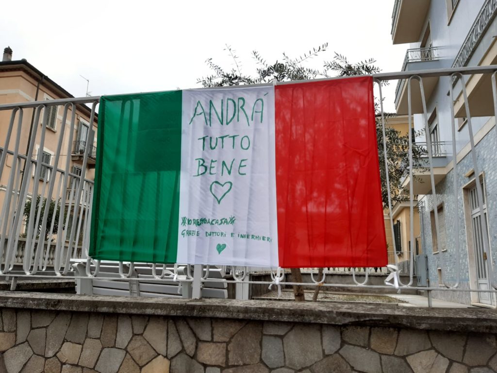 Chieri, sabato pomeriggio: strade deserte (qui, Corso Matteotti) e la speranza che presto l’incubo finisca (bandiera e scritta in Viale Diaz).