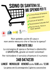 A Santena la Croce Rossa, in collaborazione con l’Amministrazione comunale, l’associazione culturale Dai e la Parrocchia Ss. Pietro e Paolo apostoli, ha attivato il progetto “Sono di Santena se….Mi spendo per te” il servizio di consegna gratuita di spesa e farmaci a domicilio, per tutti i cittadini impossibilitati ad uscire dalla propria abitazione: persone over 65, disabili e allettati, soggetti in quarantena o positivi al Covid-19. Il servizio partirà dal 16 marzo e sarà attivo tre giorni a settimana: lunedì, mercoledì e venerdì dalle 9 alle 12. Per prenotazioni si può contattare il numero 348 047 4239 lasciando i propri recapiti e una lista della spesa con al massimo 10 prodotti. La spesa sarà consegnata il giorno successivo alla richiesta. Il servizio non ha alcun costo aggiuntivo rispetto a quello della spesa.