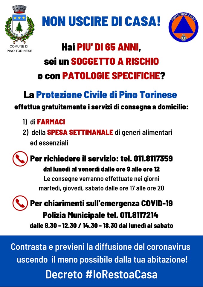Vista l’attuale emergenza sanitaria per la diffusione del virus COVID-19, si ricorda che è OBBLIGATORIO RESTARE IN CASA tranne che per urgenze o motivazioni strettamente necessarie (lavorative, di salute o bisogni indifferibili). L’Amministrazione Comunale, tramite la Protezione Civile, ha predisposto un servizio di consegna a domicilio dedicato ai pinesi più fragili, ultrassessantacinquenni, soggetti a rischio o con patologie specifiche.