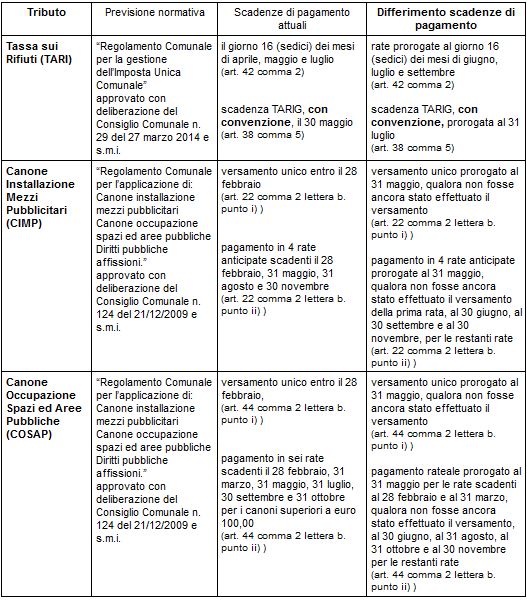 Le rate della Tassa sui rifiuti (TARI) vengono così prorogate al 16 dei mesi di giugno, luglio e settembre, la TARIG (che interessa gli operatori mercatali) viene differita dal 30 maggio al 31 luglio, mentre il versamento del Canone Installazione Mezzi Pubblicitari (CIMP) e del Canone Occupazione Spazi ed Aree Pubbliche (COSAP) vengono prorogati al 31 maggio.
