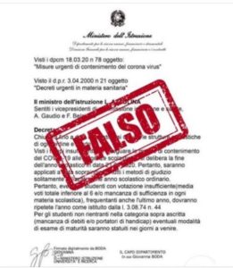 Ancora una notizia falsa. Sta circolando sul web una fake news del Ministero dell’Istruzione secondo la quale le scuole chiuderebbero fino a data da destinarsi. Il documento è stato smentito dal Ministro Lucia Azzolina, che ha dichiarato: “in un momento così delicato c’è ancora chi gioca in questo modo”. La fake news, particolarmente grave, utilizza il logo del Ministero dell’Istruzione. Il Ministro ha sporto denuncia alla Polizia Postale. Si invitano tutti gli utenti a consultare le notizie sul sito www.miur.gov.it, diffidando da messaggi o news che non siano direttamente verificabili rispetto alla fonte di provenienza.