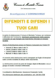 Il Comune di Montaldo Torinese, per contenere il diffondersi del Coronavirus, distribuirà gratuitamente (nella palestra comunale) ad ogni famiglia una mascherina chirurgica in tessuto lavabile.