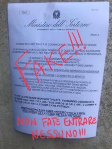 Si tratta di una cosiddetta “bufala”, già smentita dalle Forze di Polizia, messa in giro ad arte da qualche malintenzionato magari al fine di introdursi nelle abitazioni ma che sta trovando spazio sui social, negli androni dei palazzi e sui muri delle città