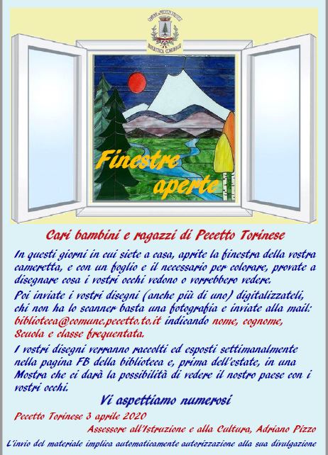 “Cari bambini e ragazzi di Pecetto Torinese,in questi giorni in cui siete a casa, aprite la finestra della vostra cameretta, e con un foglio e il necessario per colorare, provate a disegnare cosa i vostri occhi vedono o vorrebbero vedere.Poi inviate i vostri disegni (anche più di uno) digitalizzateli, chi non ha lo scanner basta una fotografia e inviate alla mail: biblioteca@comune.pecetto.to.it indicando nome, cognome, Scuola e classe frequentata.I vostri disegni verranno raccolti ed esposti settimanalmente nella pagina FB della biblioteca e, prima dell’estate, in una Mostra che ci darà la possibilità di vedere il nostro paese con i vostri occhi.Vi aspettiamo numerosi” Così l’Assessorato all’Istruzione e alla Cultura del Comune di Pecetto, in tempi di coronavirus, lancia la simpatica iniziativa “Finestre aperte”.