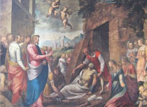 Anche il miracolo della resurrezione di Lazzaro, nella storia della Chiesa e in quella dell’arte, è stato sempre letto come un’anticipazione di un altro episodio della vita di Cristo: la sua Resurrezione. Guglielmetto Fantini, per esempio, nel battistero del Duomo, accingendosi ad affrescare il ciclo della Passione, ha iniziato proprio con la risurrezione di Lazzaro. E anche Il Moncalvo, nel dipingere la grande tela con questo soggetto che possiamo ammirare nel presbiterio della chiesa di San Domenico, aveva certamente presente quel parallelismo. Perché, noncuranti della segregazione, non andiamo a vederla virtualmente cliccando qui