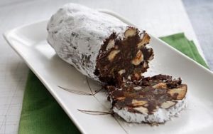 Il secondo dolce è il Salame del Papa. È un dolce tanto semplice quanto gustoso e facile da preparare, perché non richiede cottura. Impiega gli ingredienti tipici della regione, e cioè il burro, le pregiate nocciole ed il cacao. Dopo averlo modellato a forma di salame viene messo in frigo a consolidarsi e viene servito tagliato a fette. Sempre la tradizione popolare dice che quando una mangia bene, ‘mangia da Papa’. E forse proprio da questo prende il nome questo dolce della zona delle Langhe. Un salame dolce, che unisce sapori intensi come quelli del cioccolato, delle nocciole e degli amaretti. Una volta era servito quando arrivavano ospiti, accompagnato da un bicchierino di Vin Santo. Adesso potete prepararlo quando volete e servirlo alla fine di un pasto e più che mai in questo periodo i bambini saranno felicissimi di prepararlo insieme a voi!