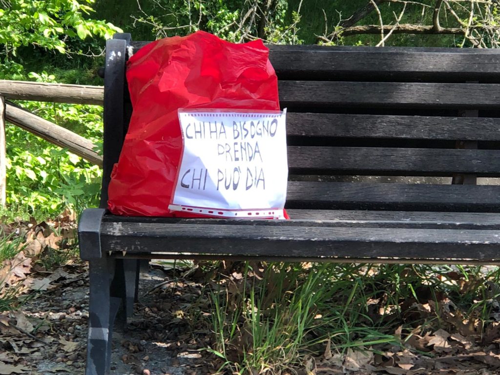A Chieri, su una panchina in viale Fasano angolo via Tana, prove di solidarietà in tempi di coronavirus, con la piccola dispensa del dare e del ricevere (Foto di Luciano Berruto)