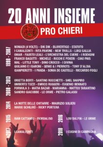 della zona, prima dell’emergenza sanitaria ed alcune delle uscite della Bela Tessioira Roberta e del Mangiagrup Stefano. I nostri personaggi sono riusciti ad essere presenti sul territorio fino al 23 febbraio, la domenica precedente al martedì grasso. Purtroppo quest’anno il Carnevale è stato interrotto bruscamente, ma la Pro Chieri spera ed è pronta a farvi vivere nel miglior modo possibile il Carnevale 2021. E che dire degli spettacoli che sono strati proposti dalla Pro Chieri negli ultimi venti anni…l’ultima edizione estiva ha contato moltissime presenze e anche quest’anno avevamo in serbo una edizione straordinaria …ma il momento non ci consente di proseguire…programmeremo nuovi concerti quando le condizioni lo consentiranno…per cui un arrivederci e un abbraccio a tutta la città di Chieri….