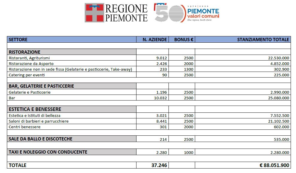 REGIONE PIEMONTE: BONUS A FONDO PERDUTO DI 2500 EURO PER PUBBLICI ESERCIZI, PARRUCCHIERI E CENTRI ESTETICI