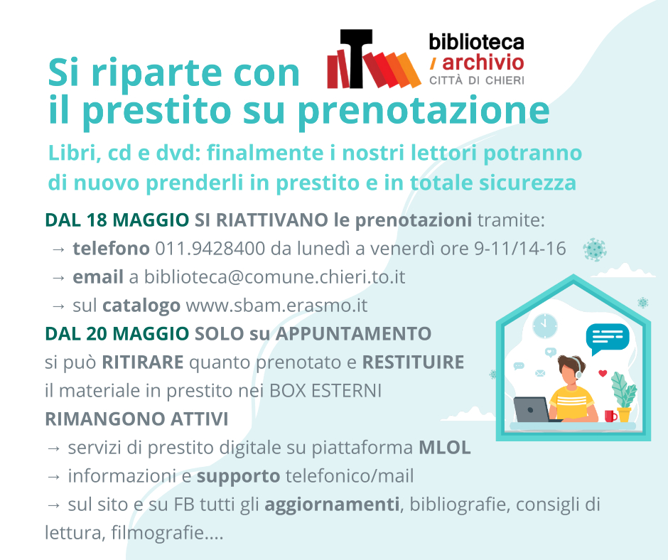 la Biblioteca Civica di Chieri rimarrà chiusa al pubblico ma da lunedì 18 maggio è possibile PRENOTARE il materiale e ritirarlo su appuntamento a partire da mercoledì 20.Ricordiamo che tutti i prestiti sono rinnovati fino al 31 maggio compreso e che è possibile RESTITUIRE il materiale sempre attraverso il box di restituzione esterno. Attivi tutti i servizi online e gli aggiornamenti alla pagina FB @BibliotecaArchivioChieri