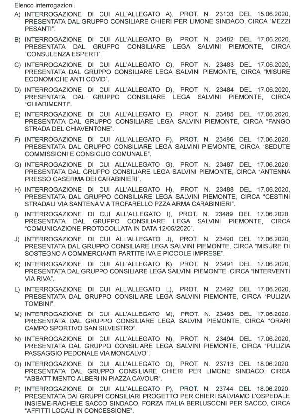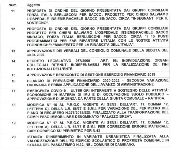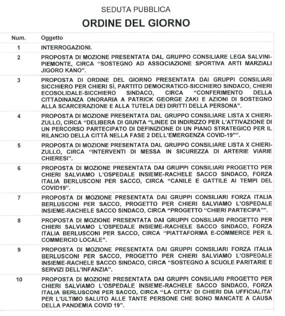 Giovedì 25 e venerdì 26 giugno dalle 19,45 torna a riunirsi, in videoconferenza, il Consiglio Comunale di Chieri. Ecco il lungo ordine del giorno.