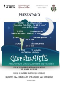 “Siamo lieti di invitarvi agli appuntamenti di Giardinarte, che anche quest’anno, seppur in forma più ridotta, abbiamo voluto programmare. Vi aspettiamo, come sempre, nel giardino del Municipio. Ingresso gratuito. Per rispetto della normativa anti-Covid, gli ingressi saranno contingentati e in caso di maltempo non utilizzeremo il Salone Italia ma cercheremo di riprogrammare la serata. Vi aspettiamo!”. Così il sindaco di Poirino, Angelita Mollo, in una nota.