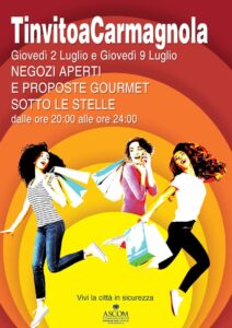 Nei giorni 2 e 9 luglio 2020, numerosi commercianti di Carmagnola in collaborazione con l’Ascom locale, propongono l’iniziativa TinvitoaCarmagnola con musica diffusa per le strade, negozi aperti, proposte gourmet e musica sotto le stelle a Carmagnola. Dalle ore 20 alle ore 24 sarà possibile fare shopping di prodotti a prezzi molto interessanti, mentre i bar e i ristoranti proporranno menù a tema nei dehors che sono stati ampliati per assicurare il distanziamento fisico richiesto dalle disposizioni anti Covid. L’iniziativa si svolge nell’area centrale della città, Lungo l’asse di Via Valobra, in Borgo Vecchio, dalla stazione ferroviaria e oltre. Una maniera leggera e rilassata per passare una bella serata a Carmagnola in tutta sicurezza, facendo compere e gustando ottimi aperitivi, apericene, cene, cibo da passeggio e after dinner per tutti i gusti. Per ulteriori approfondimenti e informazioni si invita il pubblico a consultare la pagine facebook www.facebook.com/giovedisottolestelle e il gruppo facebook www.facebook.com/groups/tinvitoacarmagnola