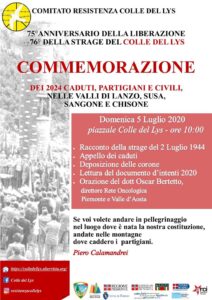 Domenica 5 luglio al Colle del Lys si onorerà a partire dalle 10 la  memoria dei 2024 caduti per la libertà nelle Valli di Susa, Lanzo, Sangone e Chisone. Alle celebrazioni sarà presente il gonfalone della Città Metropolitana di Torino, decorato della medaglia d’oro al valor civile, conferita nel 2005 dal Presidente della Repubblica per il contributo offerto dal territorio e dalle sue popolazioni alla guerra di Liberazione nazionale e alla Resistenza. A causa del Covid-19, quest’anno la commemorazione si svolgerà seguendo un programma ridotto, senza il tradizionale concerto, le fiaccolate del sabato sera, le competizioni sportive e il mercato delle tipicità locali della domenica, ma con immutato impegno. Davanti al Giardino della Resistenza e della Pace il trombettiere della banda di Mompantero intonerà “Bella ciao alla presenza dei rappresentanti delle istituzioni e delle sezioni ANPI e di tutti coloro che vorranno condividere un’occasione di memoria a 75 anni dalla fine della lotta di Liberazione. Verrà ricordata la strage del 2 luglio 1944 e saranno letti i nomi dei 32 partigiani della 17a Brigata Garibaldi “Felice Cima” uccisi dai nazifascisti. Si deporranno le corone alla base della torre monumento progettata dal comandante partigiano Franco Berlanda, eretta 65 anni fa e dedicata ai soli caduti della Brigata Garibaldi, diventata nel 1977 il monumento unitario dei 2024 caduti delle quattro valli: 718 della Val di Susa, 704 delle Valli di Lanzo, 422 della Val Sangone e 180 della Val Chisone. Seguirà la lettura del documento d’intenti, proposto da Comitato Colle del Lys e ANPI provinciale, discusso e approvato a distanza dai rappresentanti delle istituzioni. Il documento 2020 riflette sul tema della sanità e della salute come diritto personale e al tempo stesso interesse collettivo, rappresentato dalla Costituzione repubblicana nell’articolo 32: per questo l’oratore ufficiale nella commemorazione sarà il dottor Oscar Bertetto, direttore della Rete oncologica del Piemonte e della Valle d’Aosta, Il territorio del Parco del Colle del Lys (istituito nel 2004 per volontà dell’allora Provincia di Torino, oggi Città Metropolitana) figura tra quelli coinvolti nel Piano integrato tematico PaCE-Patrimonio, Cultura, Economia, finanziato dal programma Alcotra Italia-Francia. Nell’ambito del piano, l’intervento della Città Metropolitana per coordinare la valorizzazione della memoria storica della Resistenza metterà in rete percorsi, italiani e francesi di rilevanza storica, in una prospettiva di turismo sostenibile, compresa la promozione del percorso “Sentieri Resistenti”