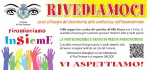 Ricominciamo insieme!Da martedì 21 luglio ci si ritrova per trascorrere alcune serate all’insegna del divertimento, della condivisione, dell’intrattenimento. Le iniziative, che in parte riprenderanno la programmazione del Cinema Diffuso, si terranno nella suggestiva cornice del giardino di Villa Grazia … una bella occasione per trascorrere piacevoli momenti sotto le stelle pinesi! Il calendario delle iniziative è in continuo aggiornamento ed è disponibile sul sito del Comune di Pino alla pagina https://bit.ly/2CKhJbF