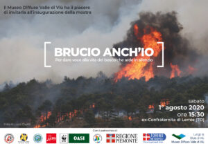 Il Museo Diffuso Valle di Viù ospita nel prossimo mese di agosto, nella sede dell’ex Confraternita di Lemie, l’esposizione collettiva “Brucio Anch’io. Per dar voce al bosco che arde in silenzio”, condividendo del tutto l’obiettivo della mostra di richiamare l’attenzione sulle orribili e pesanti conseguenze dovute al passaggio degli incendi nei boschi. Pitture, sculture e fotografie, opere di una trentina artisti che partecipano volontariamente a portare avanti il messaggio, tra i quali Cristina Girard – illustratrice naturalistica-conducono l’osservatore dentro l’incendio, per guardarlo con gli occhi di chi arde in silenzio e cerca di far capire quale e quanta sofferenza coinvolge ogni forma di vita della foresta. Il progetto Brucio Anch’io ha preso avvio grazie a Federica Caprioglio e a Marco Demaria, in collaborazione con il Civico Museo Didattico di Scienze Naturali “Mario Strani” di Pinerolo, subito dopo gli spaventosi roghi che tra il 22 e il 29 ottobre 2017 si svilupparono in molte località del Piemonte. Oltre diecimila ettari di territorio furono percorsi dalle fiamme, portando morte e devastazione per milioni di creature inermi. La sola Valle di Susa perse più di tremila ettari di foreste, bruciando per giorni e giorni. Il problema degli incendi procurati dalla disattenzione e a volte dall’intento di fare danno si ripropone periodicamente non solo in Piemonte e purtroppo molti organi d’informazione evidenziano i danni procurati a persone e manufatti, trascurando quasi completamente la distruzione della natura e il dramma vissuto dalle creature che soccombono soffocate o bruciate vive per l’impossibilità di fuggire. Il progetto di sensibilizzazione, patrocinato dalla Regione Piemonte, comprende anche la realizzazione di eventi, quali conferenze e spettacoli, ma per le misure di sicurezza anti-covid 19, a Lemie sarà allestita solo l’esposizione artistica.