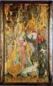 La raccolta fondi organizzata presso la Chiesa di Santa Maria di Vezzolano a partire dall’inverno 2012-2013, in occasione della presentazione del Presepe di Annarosa Nicola, ha permesso di finanziare numerosi restauri di opere d’arte da salvare. Ultimamente avevamo in programma il restauro dell’Altare di San Maurizio, nella cappella a destra dell’ingresso, ma il progetto è stato sospeso a causa di alcune difficoltà burocratiche. Nel frattempo si è presentata l’occasione di un intervento decisamente prestigioso. Sono state infatti individuate due tavole lignee, che si pensava fossero disperse, dipinte da entrambi i lati, che nella prima metà del ‘900 si trovavano appese accanto all’altare nell’abside principale, ma probabilmente erano state realizzate come ante a protezione del gruppo scultoreo di Carlo VIII, l’altare in terracotta dipinta. Si tratta di opere attribuibili ad Antoine de Lonhy (o alla sua scuola), pittore attivo in Borgogna e nel ducato di Savoia nella seconda metà del XV secolo. Le tavole, custodite per secoli nella chiesa di Vezzolano senza la cura necessaria, in quanto non ritenute importanti, sono in condizioni precarie; ma lasciano trasparire ugualmente la mano di un artista dal gusto sicuro e dalla grande personalità. Il progetto è decisamente oneroso, molto di più di tutti quelli precedentemente realizzati. Tuttavia il residuo delle raccolte precedenti arriva quasi a coprire il costo dell’intervento su una facciata di una di queste tavole. Abbiamo proposto, per l’affinità con l’occasione del Presepe, di restaurare l’immagine della Natività qui riprodotta. Ci sembra un’occasione importante per valorizzare la nostra Chiesa di Santa Maria di Vezzolano e un autore che recentemente è oggetto di importanti studi e di una stimolante rivisitazione. Vi comunicheremo appena possibile quanto si sarà concordato in proposito con la Direzione Generale Musei del Piemonte, e le modalità per contribuire al recupero di tali opere, che verranno esposte in mostra presso importanti luoghi di cultura.