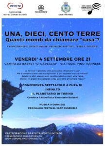Si terrà il prossimo 4 settembre alle ore 21 presso il campo da basket D. Gaveglio (via Folis, Pino Torinese) l’evento off del Perinaldo Festival “Terre di confine”: in collaborazione con l’Associazione Apriticielo, il Comune di Pino Torinese e Infini.To – Planetario di Torino, Museo dell’Astronomia e dello Spazio propongono la conferenza – spettacolo “Una, dieci, cento terre. Quanti mondi da chiamare casa?”. La prima rappresentazione dell’evento è stata commissionata dal Perinaldo Festival XIV edizione, realizzata in residence e proposta al pubblico nel mese di luglio, nell’ambito del cartellone di appuntamenti culturali della rassegna. La manifestazione è organizzata dal Comune di Perinaldo (IM) in partenariato con l’Associazione Orchestra da Tre Soldi di Torino e da molti anni è riconosciuta come uno dei più dinamici e attesi appuntamenti culturali estivi nel territorio del ponente ligure. Si svolge con sede principale a Perinaldo (entroterra ligure di ponente in provincia di Imperia) e coinvolge numerosi Comuni della costa con differenti eventi che vedono la partecipazione di artisti di fama nazionale e internazionale. La rassegna è cofinanziata dalla Fondazione Compagnia di Sanpaolo attraverso il progetto Performing Plus. Visto lo stretto legame del Comune di Pino Torinese con Infini.To, che negli anni ha portato alla realizzazione di iniziative e progetti in stretta sinergia tra le due realtà, e data la presenza sul territorio del Planetario, che ha sede proprio a Pino, si è quindi voluto riproporre anche qui questo appuntamento quale evento “off” del Festival. L’Astrofisico Emanuele Balboni condurrà la serata, con un accompagnamento musicale jazzistico: un evento che vuole unire divulgazione scientifica e musica, in un’atmosfera suggestiva durante la quale si parlerà del nostro Pianeta e del suo futuro: “La Terra è il pianeta che possiamo chiamare “casa”. Ma è sempre stata così accogliente? E per quanto lo sarà ancora? Esistono altri pianeti con caratteristiche simili alla Terra, mondi in grado di ospitarci e che potremo chiamare “casa”?”. Sul palco con lui il Perinaldo Festival Jazz Ensemble che proporrà al pubblico della serata una performance musicale ricca di atmosfere jazz e rock: il gruppo è composto da Emanuele Balboni – chitarra, Gabriele Peretti – batteria, Giacomo Petrocchi – sax tenore e Viden Spassov – contrabbasso. “E’ sempre un grande piacere promuovere iniziative in sinergia con il nostro Planetario – spiega il Sindaco, Alessandra Tosi -. Infini.To è infatti una delle grandi eccellenze del territorio, elemento di richiamo turistico che ogni anno porta a Pino migliaia di visitatori. Per questo non potevamo non replicare anche nel nostro Comune l’evento promosso dal Planetario nell’ambito del ‘Perinaldo Festival’: un’occasione per unire la scienza all’arte in una serata che siamo certi sarà ricca di momenti suggestivi. Questo evento si inserisce inoltre nel weekend ‘in musica’ di Pino Torinese, che il 5 e 6 settembre vedrà l’edizione 2020 della Masterclass di Musica da Camera con esibizione di allievi e docenti e il gran finale con il concerto del Gruppo da Camera dei Berliner Philharmoniker.”