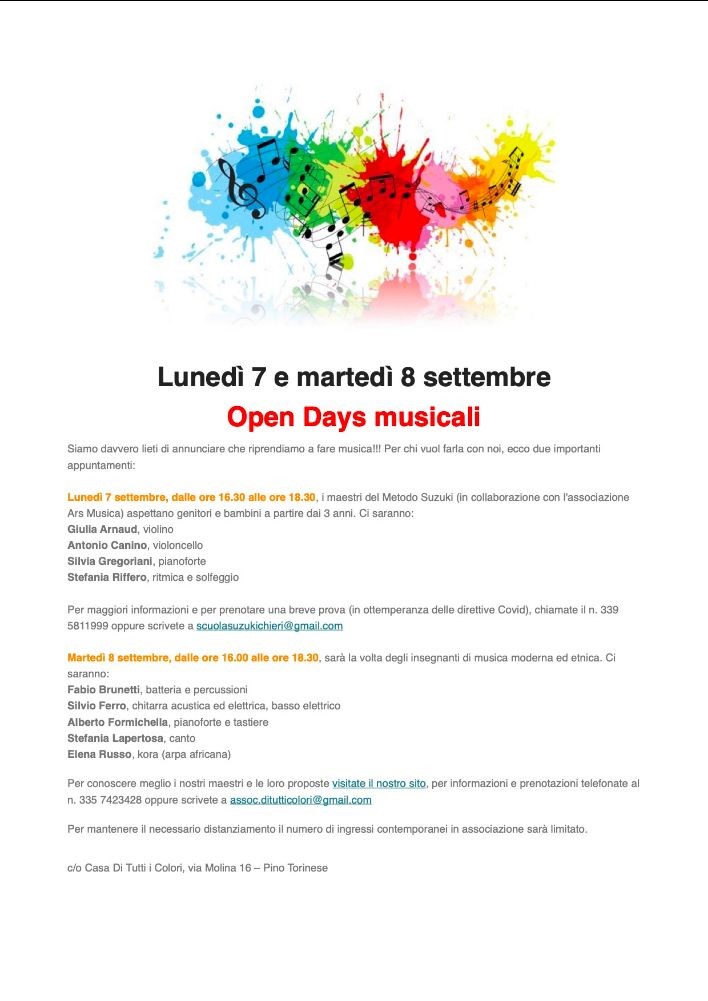Pino Torinese, lunedì 7 e martedì 8 settembre gli “Open Days Musicali” con l’Associazione Di Tutti i Colori di Redazione · 6 Settembre 2020 Visto da: 34