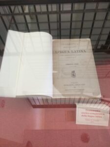 La mostra in oggetto è in programma dal 4 settembre fino al 5 ottobre presso la Saletta Espositiva della Biblioteca Civica di Chieri ed è dedicata all’esposizione di alcuni tra i più significativi esemplari di grammatiche e sintassi, custoditi presso il fondo storico della suddetta Biblioteca. L’allestimento, a cura del bibliotecario CoopCulture Sandro Molinu, prevede l’esposizione di oltre 20 esemplari tra cinquecentine, seicentine, settecentine e vari volumi dell’Ottocento. Questo percorso ideato in un periodo storico sociale complesso ove l’incertezza e il cambiamento regnano sovrani, quasi come un brindisi speranzoso e sotteso ai nuovi inizi, volge lo sguardo agli albori della nascita della Biblioteca Civica “Nicolò e Paola Francone”, avvenuta in un periodo storico di transizione: il passaggio da una realtà socio-economica prettamente agricola ed artigianale ad una di stampo industriale. Dal patrimonio librario del Fondo Francone emerge, brillando di luce propria, il primo volume individuato dal giovane Nicolò Francone per l’istituzione della “sua” biblioteca: la Grammatica storico-comparativa della lingua latina. Giusta i risultati degli studi più recenti. Brevemente esposta agl’Italiani e specificamente ai professori di lingue classiche, di Domenico Pezzi, edita da Hermann Loescher nel 1872. La lingua latina, simbolo di una cultura di forte stampo umanistico; una grammatica di tipo storico-comparativo, volta dunque ai più innovativi metodi di ricerca linguistica dell’epoca; una grammatica, a rimarcare il rigore, la concretezza e la stabilità di un progetto biblioteconomico; l’autore: Domenico Pezzi, autorevole linguista dell’Università di Torino, stretto collaboratore della casa editrice Loescher, cui si deve una parte importante dello svecchiamento e della sprovincializzazione della cultura italiana post-unitaria, per la quale sarà cofondatore della Rivista di filologia e d’istruzione classica, primo periodico italiano dedicato allo studio della classicità letteraria greca e latina. (cit. dal Manifesto della mostra): elementi questi che lasciano dedurre da parte di Nicolò Francone una scelta ben ponderata, di un certo calibro e spessore, che ben s’insediava nel contesto di trasformazione socio-culturale. Un valore simbolico forte il cui messaggio, nonostante lo scorrere del tempo, resta vivo e pulsante tutt’ora.