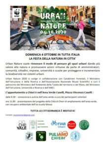 TUTTA LA CITTADINANZA È INVITATA!È unacollaborazione di CiòCheVale, Consulta Comunale per l’Ambiente, FiabChieri-MuovitiChieri!, Fridays For Future, Il Tuo Parco, Piantiamola!, PuliAMOchieri, Un Punto MacrobioticoL’evento Urban Nature 2020si svolge in collaborazione con Carabinieri Forestali, il Ministero dell’Istruzione e della Ricerca e dell’Associazione Nazionale Musei Scientifici e con il patrocinio del Ministero dell’Ambientedella Tutela del territorio e del Mare, delMinisterodell’Istruzione, Università e Ricercae dell’ANCI. Sarà un grande occasione per lanciare la forte richiesta diripensare le nostre città in funzione dei sistemi naturaliche le circondano. Le nostre città possono essere ridisegnatemettendoal centro la gestionevirtuosadel territorio urbanizzato, contenendo il consumo di suolo, progettando e riqualificando gli spazi liberi e verdii nostri corsi d’acqua e le zone umidein funzione deltutela e valorizzazione del nostro capitale naturale, delbenessere, della qualità della vita e della sicurezza delle popolazioni. Scopri l’iniziativa : https://www.wwf.it/urban_nature.cfmContatti: muovitichieri@gmail.com, * Le attività di pulizia sono a partecipazione libera. A chi desidera prendervi parte raccomandiamo un abbigliamento e scarpe adatti, un paio di guanti da giardinaggio. Dovranno essere rispettate le norme per la protezione dal Covid-19 (uso della mascherina e distanziamento)