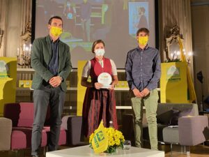 Nella foto: Silvia Pennati in abito tipico della sua valle ritira il premio, a sinistra Danilo Merlo, delegato Giovani Impresa Piemonte, a destra Jair Vidi, delegato Giovani Impresa Valle d’Aosta.