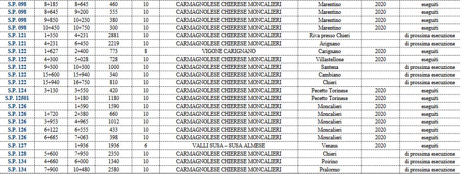 IN ALLEGATO l’ELENCO DELLE ASFALTATURE 2020 (STRADE; CHILOMETRICHE; TERRITORI; STATO DI ESECUZIONE) NEL CHIERESE, MONCALIERI E CARMAGNOLESE