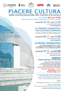 Si apre venerdì 23 ottobre PIACERE CULTURA – dalla crescita personale alla crescita economica, una serie di tre incontri presso il Centro Eventi Il Maggiore di Verbania per approfondire l’ambito culturale e le sue possibili declinazioni. Due lectiones magistrales nel tardo pomeriggio e une serata dedicata al racconto scenico compongono la rassegna che vede la partecipazione del Professor Maurizio Vanni, Museologo, storico dell’Arte e Specialista in Governance museale. La partecipazione agli incontri potrà avvenire in loco oppure in streaming attraverso un apposito link. In entrambi i casi è necessaria la prenotazione. Il progetto nasce grazie alla collaborazione del Centro Eventi Il Maggiore, del Comune di Verbania, di Verbania Capitale Italiana della Cultura 2022, dell’Università del Piemonte Orientale, di Ars.Uni.Vco e Regione Piemonte. Gli incontri, a ingresso gratuito, sono aperti a tutti, in particolare ci rivolgiamo alle scuole, ai loro studenti e docenti, e alle associazioni che possono trovare degli spunti di riflessione interessanti e utili per le loro attività. Dato il numero limitato di posti a disposizione nel rispetto delle normative anti-contagio (capienza massima 200 posti per la lectio magistralis e 196 posti per il racconto scenico), per poter partecipare è obbligatorio prenotarsi online entro le ore 18.00 del giorno antecedente l’evento al seguente link: https://forms.gle/EAqurBLmp36rWwze8. Nel caso in cui si desideri assistere da remoto, sarà possibile seguire la diretta degli eventi attraverso un link che verrà fornito a seguito della prenotazione.