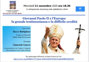 Mercoledì 11 novembre alle ore 18.30  in collegamento tramite la piattaforma Zoom . Introduzione di  Giancarlo Guasco, vicepresidente del Centro Culturale San Francesco del Carlo Alberto. Intervento di  Rocco Buttiglione Istituto di Filosofia “Edith Stein”di Granada