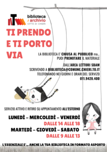 Chieri, Biblioteca: “Ti prendo e ti porto via”RESTARE A CASA CON I LIBRI E’ PIU’ FACILE E PIU’ BELLO!
